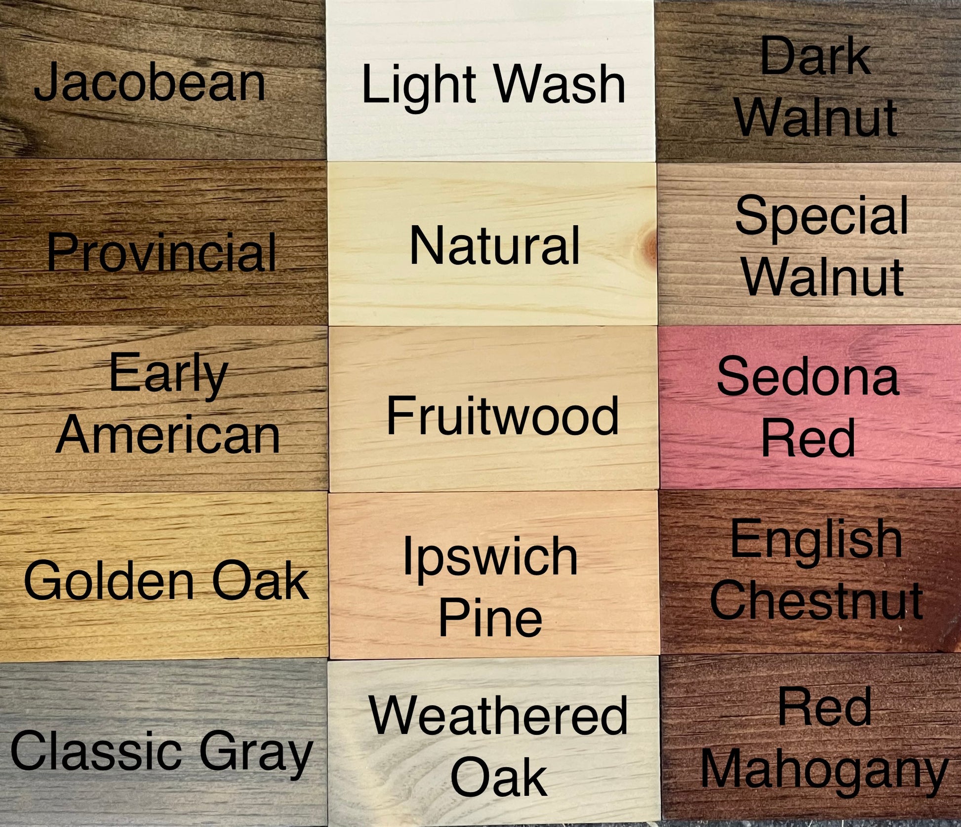 I also included a picture in the listing of the Minwax Stains. Any of these stains we can do. Just select Custom Stain from the dropdown menu and then put a note with the order specifying which one you would like. NOTE: These samples aren't done by us and the color that your ladder shelf will be will likely vary somewhat from the Minwax Sample color. If you have questions about a particular stain just convome.