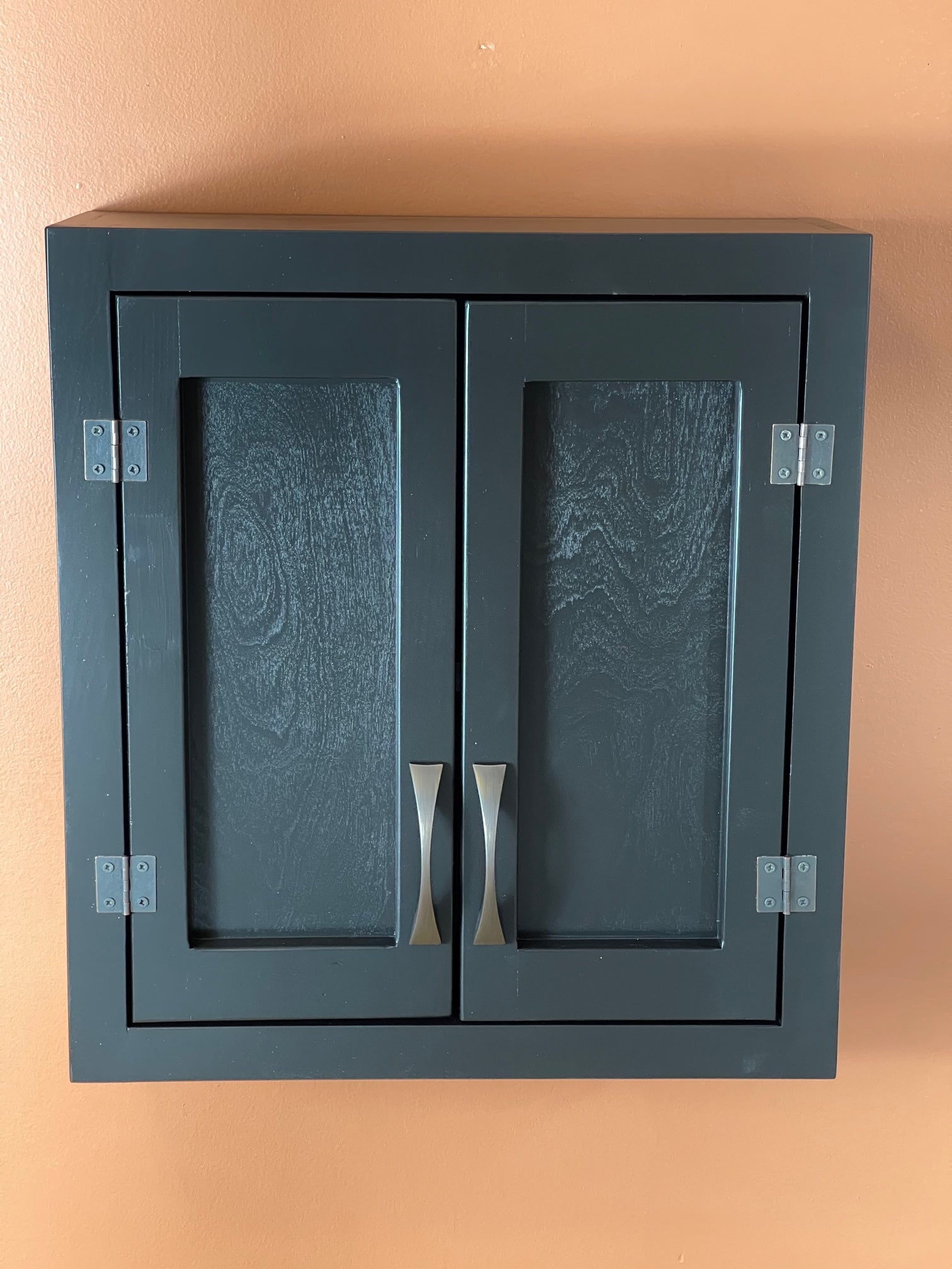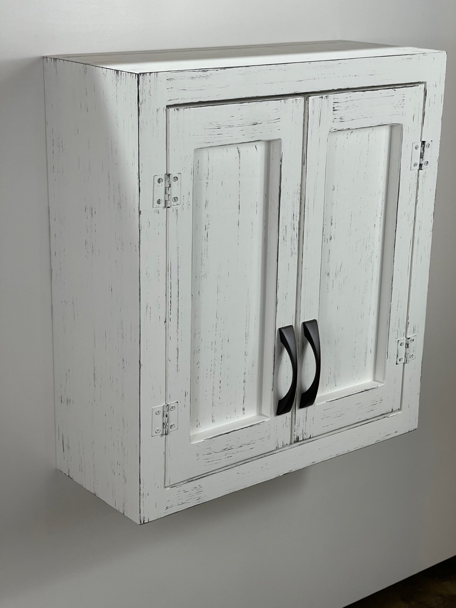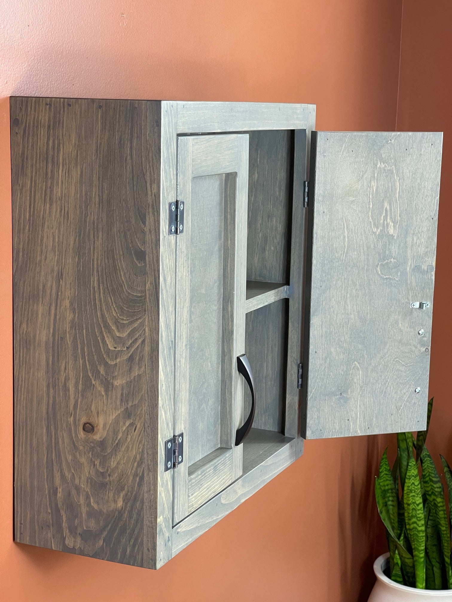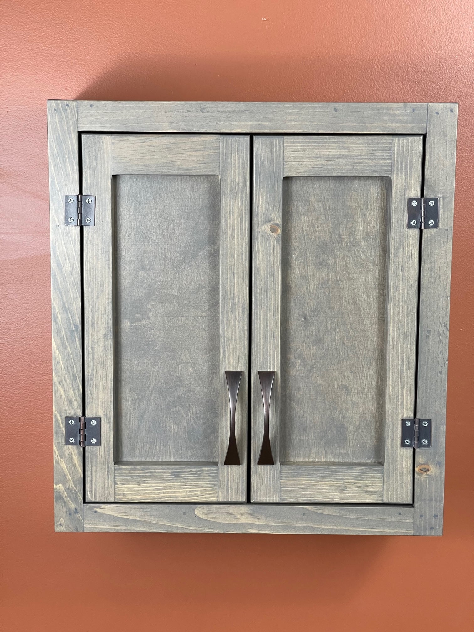 This is a beautifully finished wall mounted cabinet. It would make a great medicine cabinet or bathroom cabinet. The main pictured shelf is finished in Classic Gray stain and has overall dimensions of 8" deep x 20" wide x 22" tall. If you need other dimensions please message me.