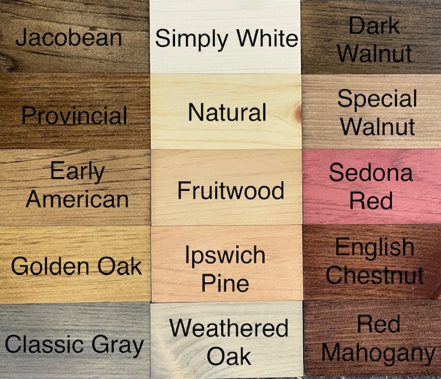 We build these by hand out of Eastern White Pine. Surfaces are sanded smooth and finished professionally. We cover all our stains with multiple coats of a high quality lacquer to protect it.